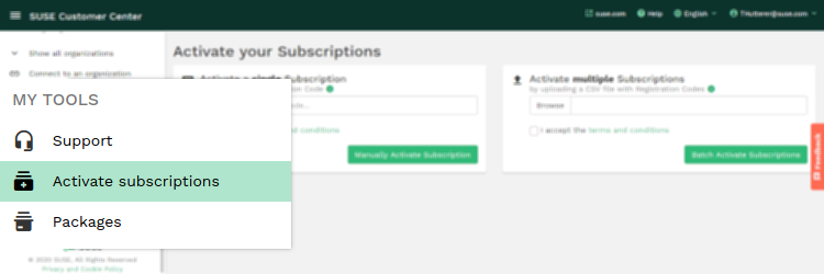 Cuando se adquiere una suscripción, se añade automáticamente a la página Suscripciones del Centro de servicios al cliente de SUSE. Cuando se realiza la compra, el contacto principal del pedido recibe un correo electrónico. Haga clic en la URL del correo electrónico y siga las instrucciones de la página para obtener el código de registro. A partir de ese momento, podrá usar el Centro de servicios al cliente de SUSE para gestionar la suscripción según se describe en esta sección.