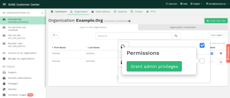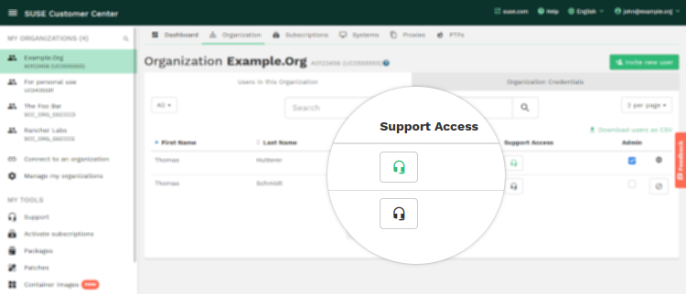 El Centro de servicios al cliente de SUSE le permite otorgar acceso a la información de la organización a cualquier usuario que desee. Puede tratarse de compañeros de trabajo, otras personas interesadas de la empresa, el representante de ventas de SUSE o un distribuidor.