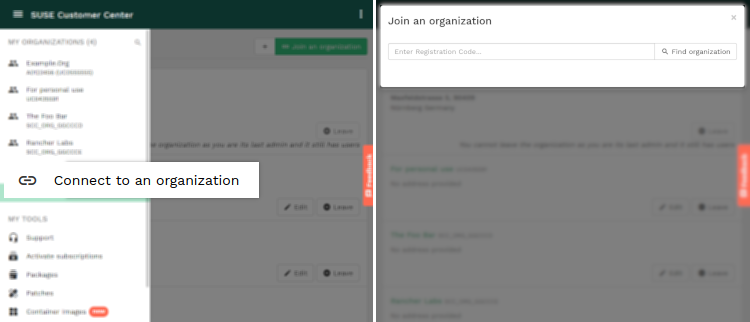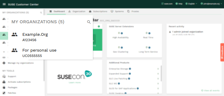 Un usuario puede tener asociadas varias organizaciones en el Centro de servicios al cliente de SUSE. Esto resulta de utilidad, por ejemplo, si un distribuidor necesita usar una entrada única del Centro de servicios al cliente de SUSE para ver y gestionar información de varios clientes.