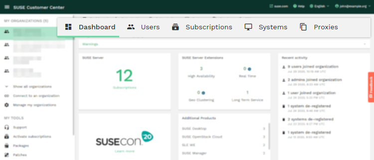 En el Centro de servicios al cliente de SUSE, las cuentas se colocan en organizaciones. Por ejemplo, una organización puede representar a una empresa y contener los sistemas y suscripciones registrados para esa empresa.