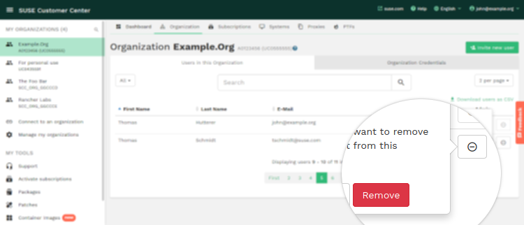 NOTA: es posible añadir cualquier usuario a la organización introduciendo una dirección de correo electrónico válida. Sin embargo, para acceder al Centro de servicios al cliente de SUSE, cada usuario debe disponer de una cuenta de entrada donde se use la dirección de correo electrónico que ha asignado. Los usuarios pueden crear una cuenta de entrada de SUSE la primera vez que acceden al Centro de servicios al cliente de SUSE, como se describe en la sección “Entrada al Centro de servicios al cliente de SUSE”.